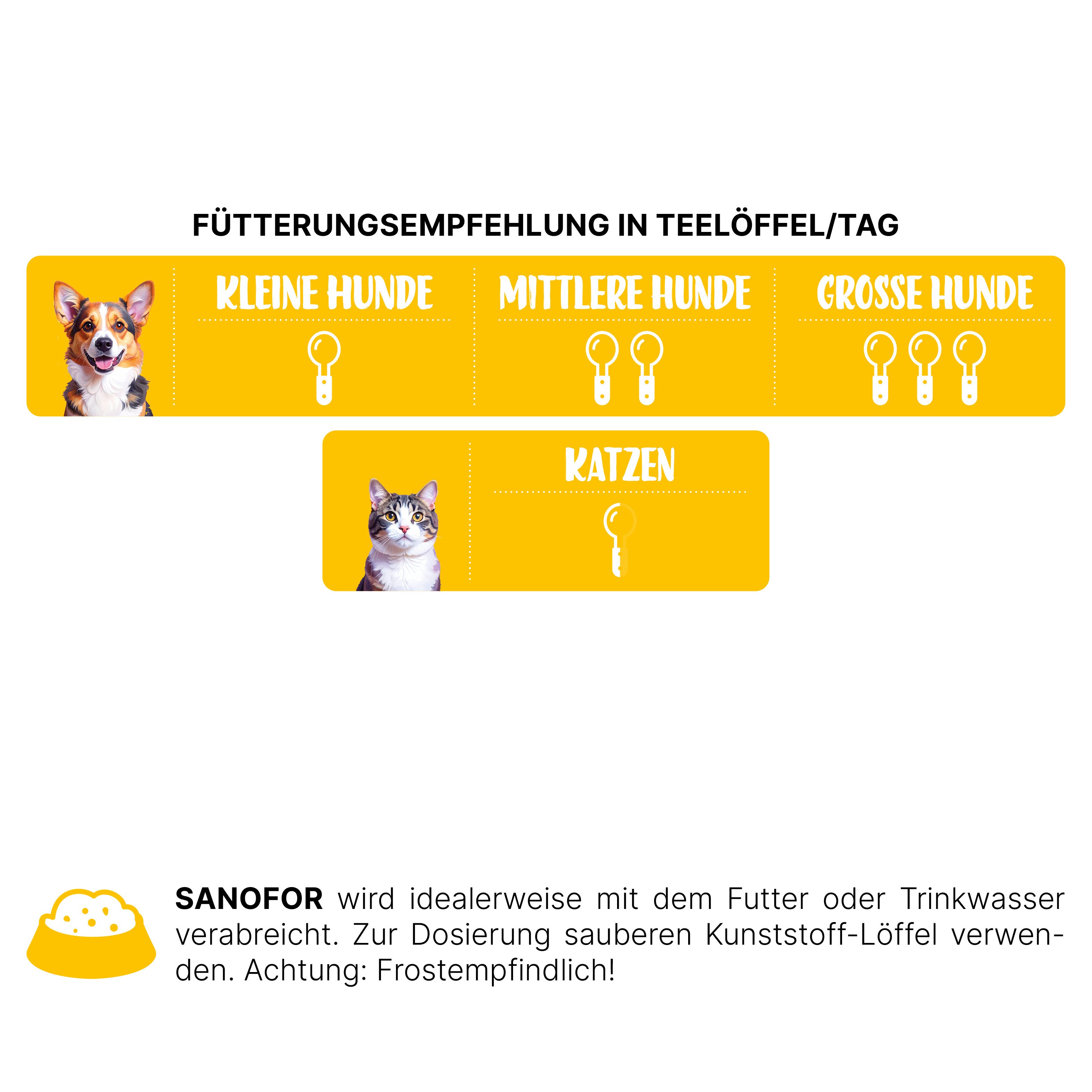Es hat keine Nebenwirkungen, da es nur im Darm wirkt. sanofor stärkt Jungtiere, fördert bessere Fresslust, hohe Leistung und schönes Fell.